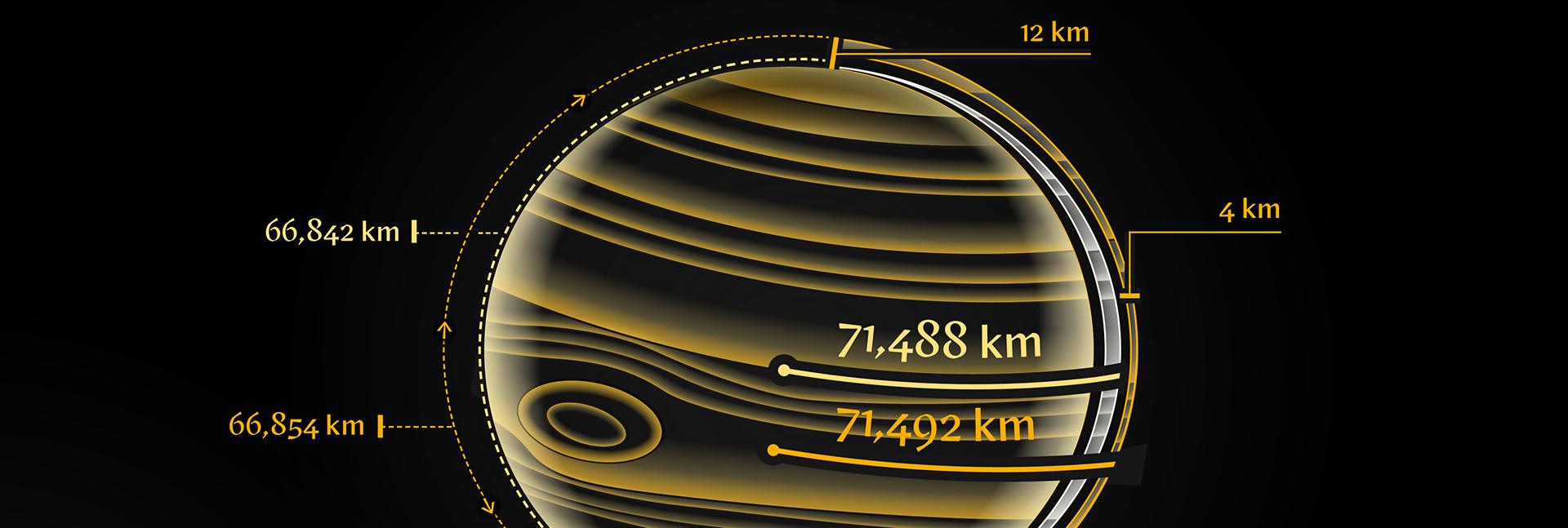 According to the updated measurements, Jupiter’s equatorial radius is about 7 percent greater than its polar radius. Earth’s equatorial radius, by comparison, exceeds its polar radius by just 0.33 percent. This means Jupiter is roughly 20 times flatter than Earth, due to the combined effects of the gas giant’s rapid rotation, complex internal structure and atmospheric winds.